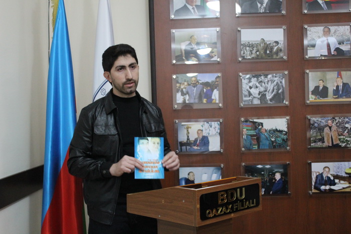 Sonra Elmar Sahib çıxış edərək müəllif olduğu kitabın 44 günlük Vətən müharibəsində şəhidlik zirvəsinə yüksəlmiş, ölümündən sonra “Vətən uğrunda”, “Laçının azad olunmasına görə”, “Suqovuşanın azad olunmasına görə” medalları ilə təltif olunmuş filialın məzunu Məhəmməd Məmmədovun ömür yolundan bəhs etdiyini bildirib.